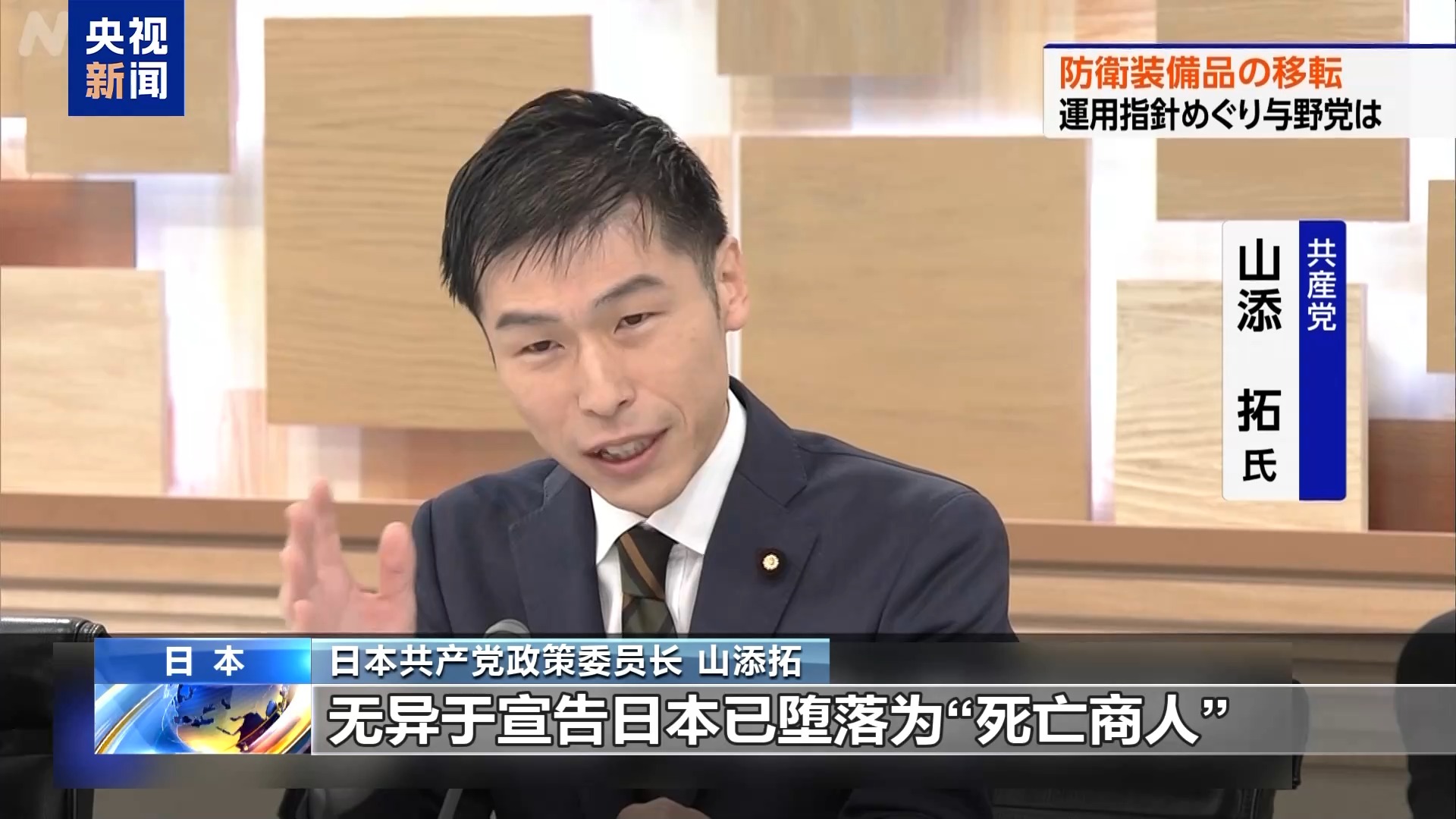 日本共产党政策委员长 山添拓:高市政府为武器出口“松绑”,无异于宣告日本已堕落为“死亡商人”。日本不能成为武器供给源,更不能以武器交易牟利,应当回归和平国家。